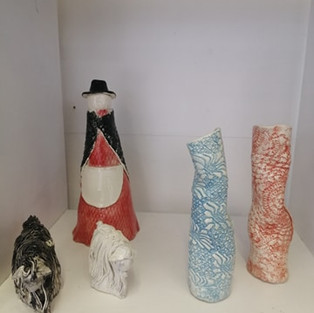 A. At the beginning of lockdown I brought some of my studio to my house so I could continue to make and this included my pottery wheel so I could practise throwing, however I dont think this is my forte but will continue to possibly combine thrown and slab work together. I was also inspired to make a covid-19 atom which I turned into a money box and inspired by Grayson Perry art club to make a lockdown house. I then also made some houses and rainbows to raise some money for charity.