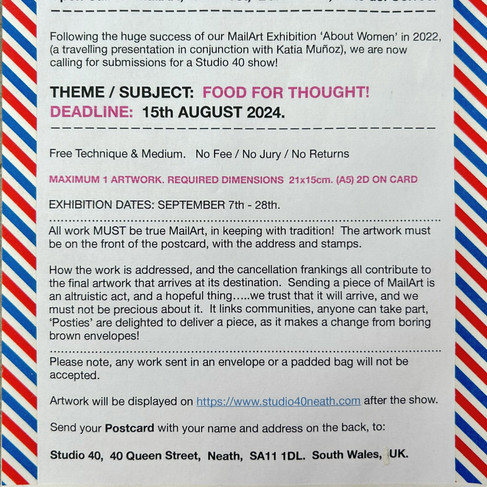Following the huge success of our MailArt Exhibition ’About Women’ in 2022, (a travelling presentation in conjunction with Katie Muñoz), we are now calling for submissions for a Studio 40 show!
